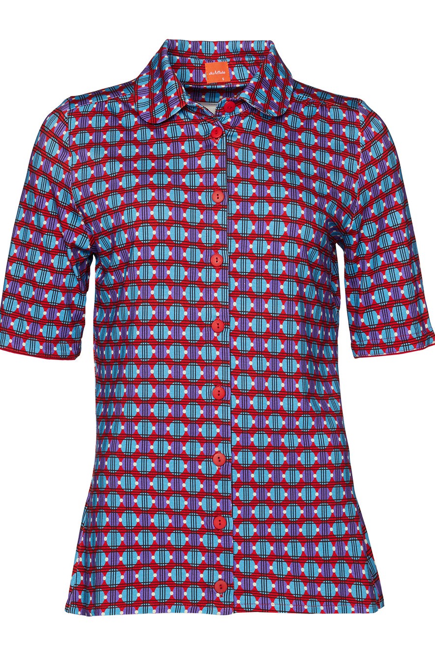 Mjuk trikåblus med knäppning och krage. Ganska smal i modellen.