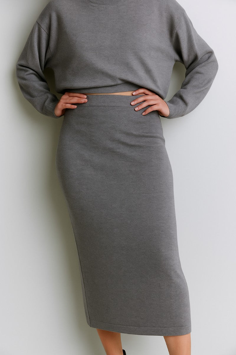 Rak stickad kjol med resårmidja. Ca 77cm lång.