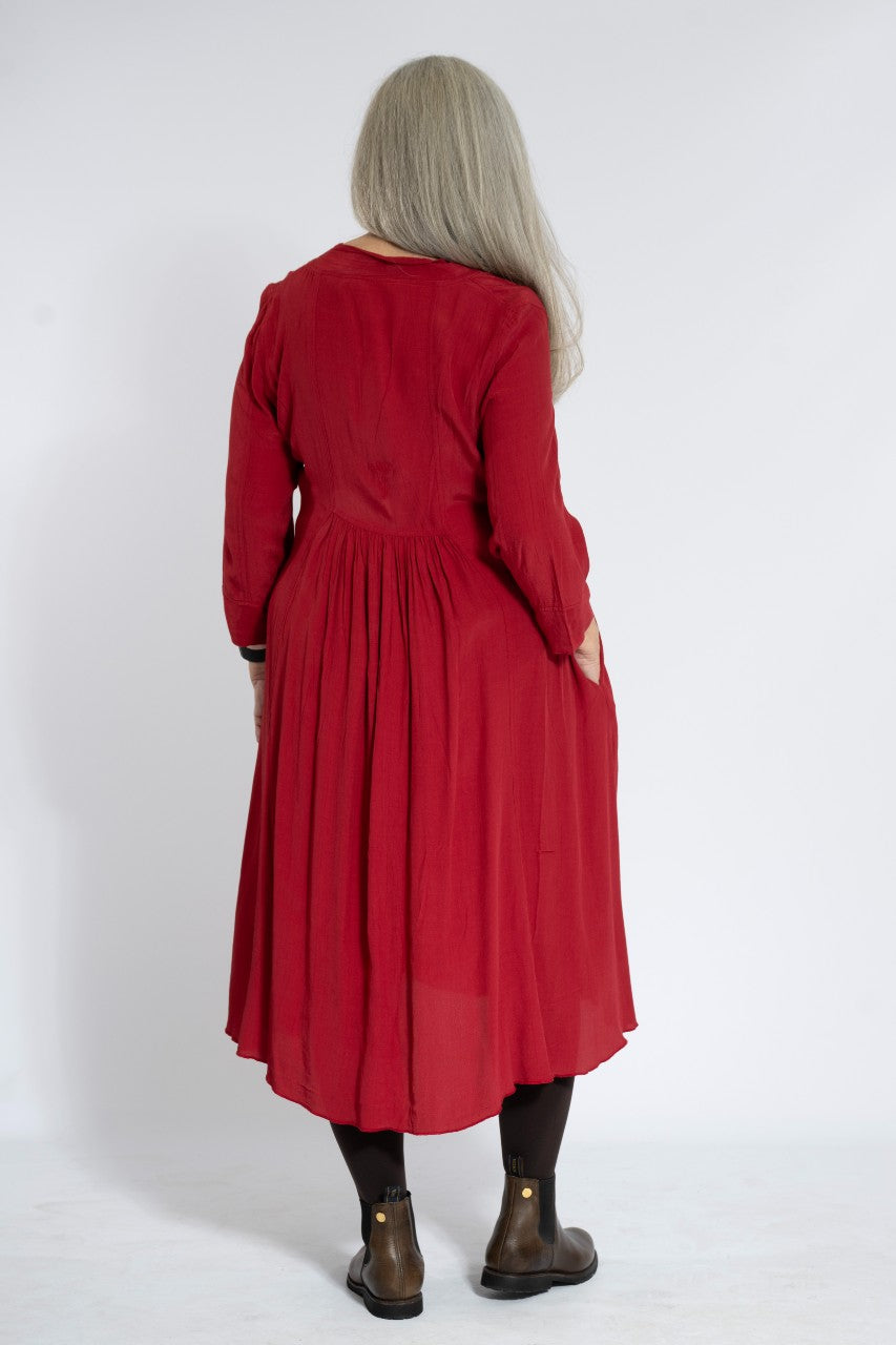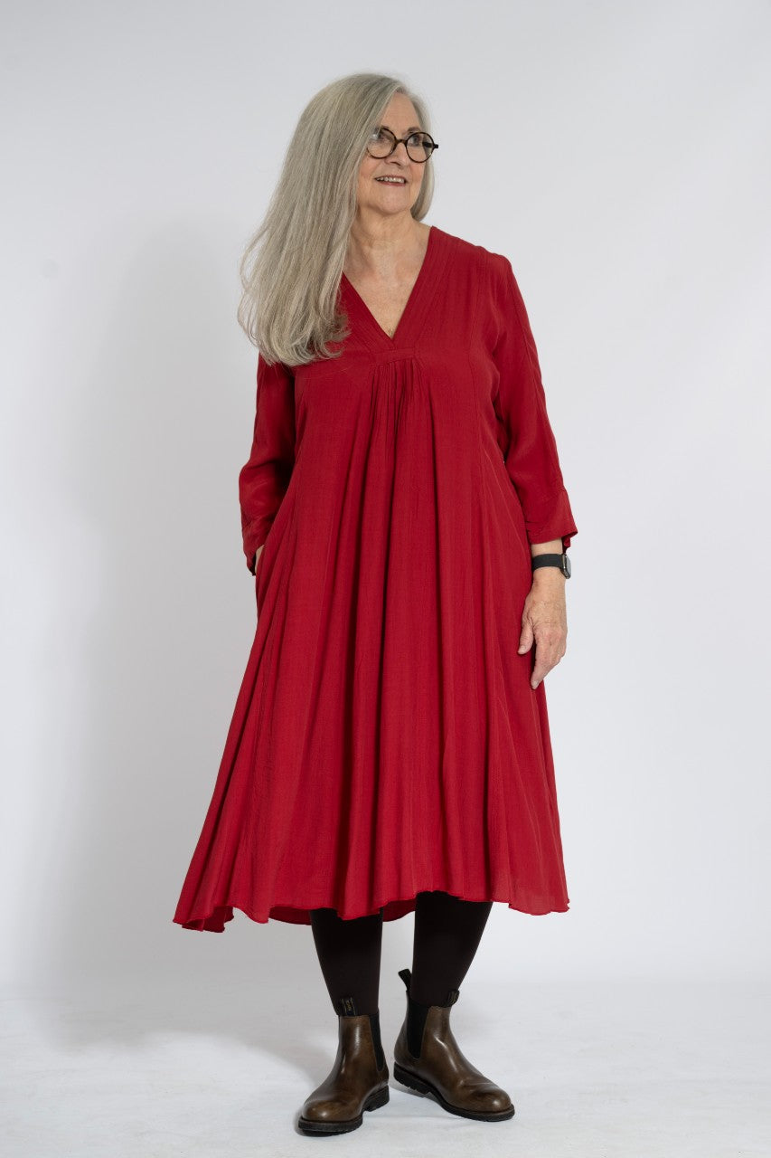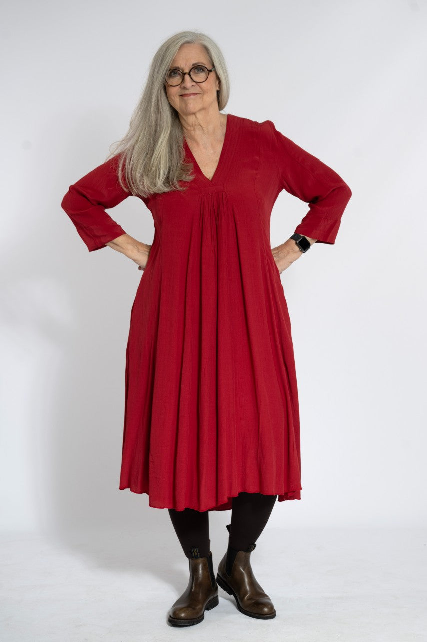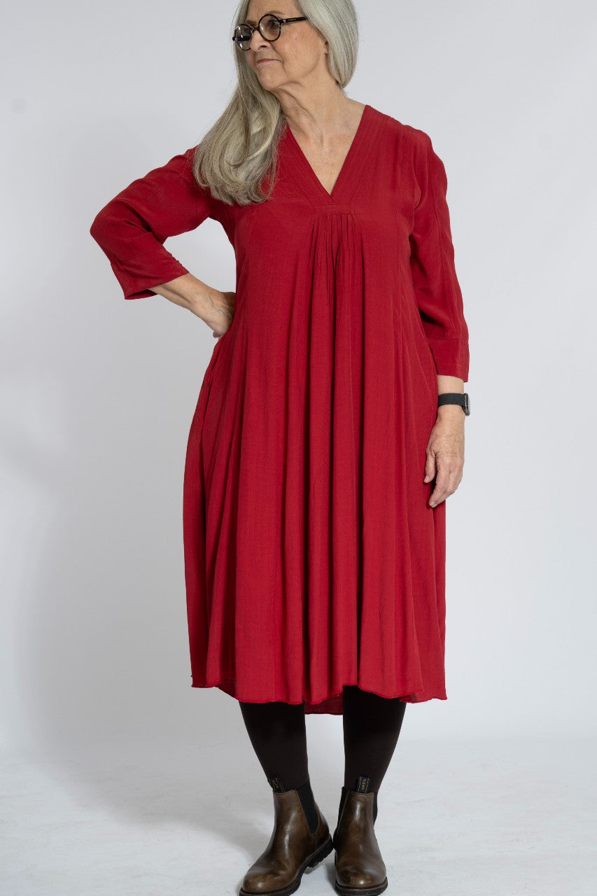 Klänning i viscosecrepe sydd i många våder så att den får fint fall i kjolen. Fickor i sidorna.