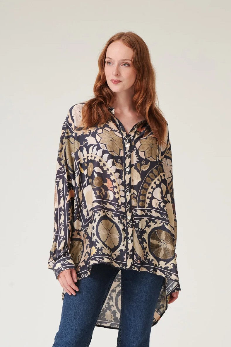 Rymlig skjorta i fantastiskt print. Något längre bak än fram.