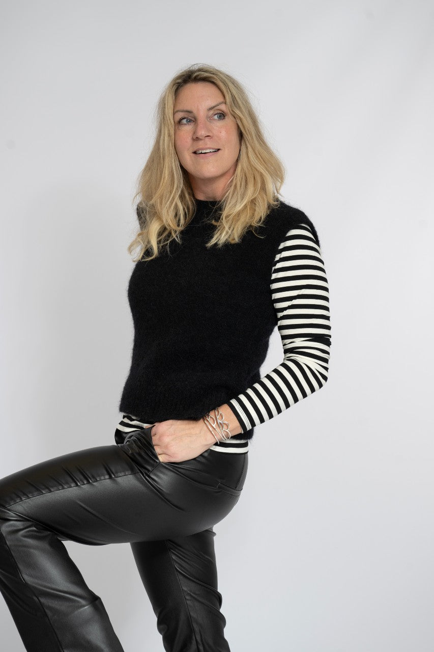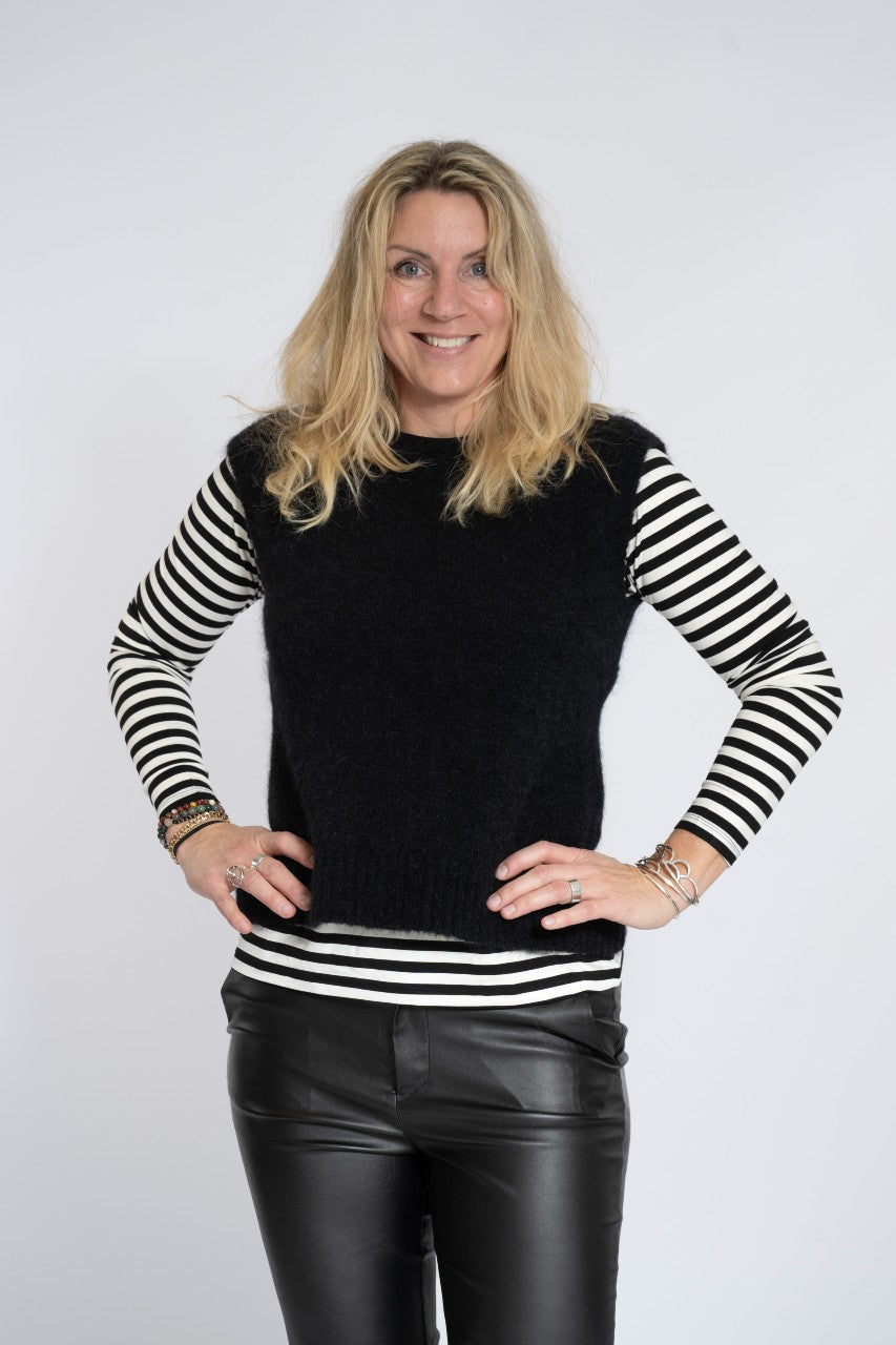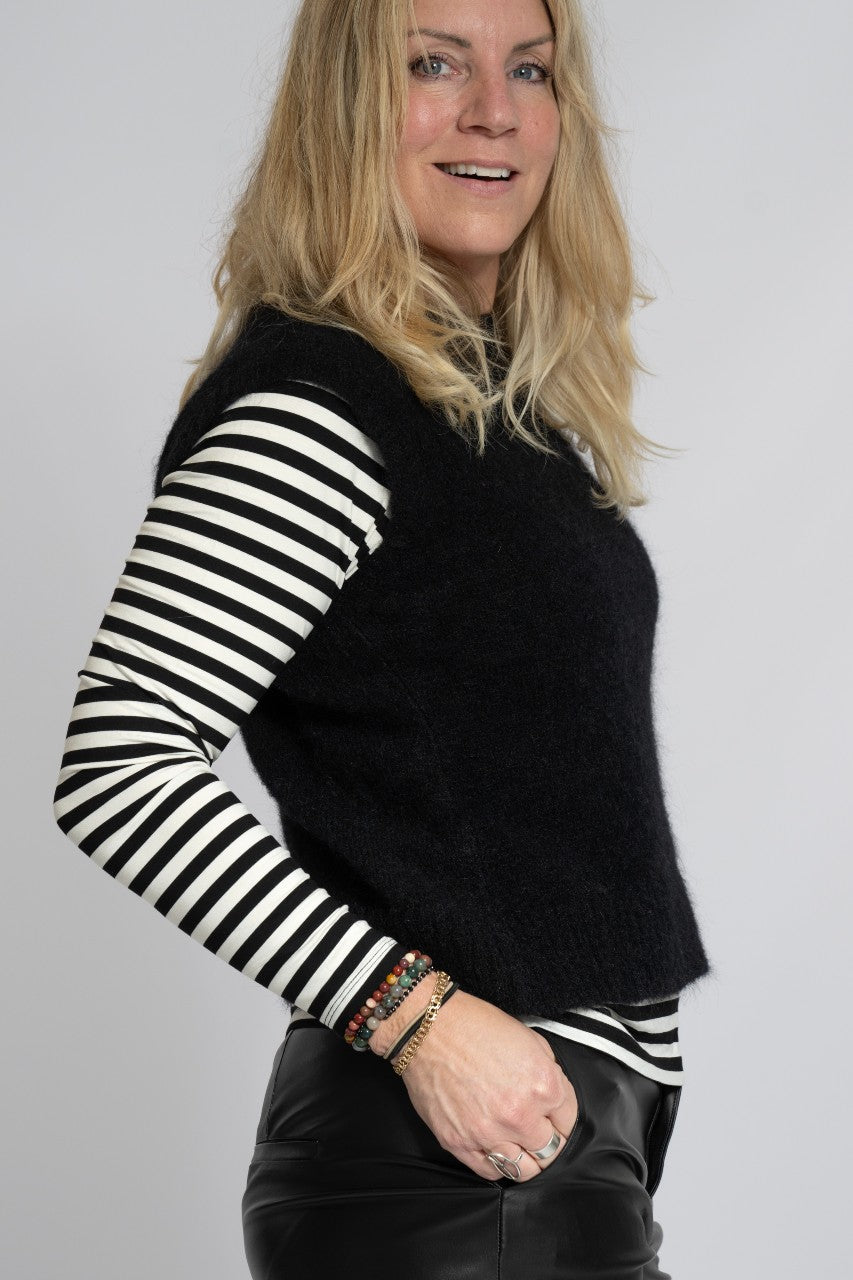 Slätstickad ärmlös topp/väst i mjuk och fluffig kid mohair. Ribbstickade avslut och normal passform. Garnet är certifierat enligt Responsible Mohair Standard (RMS) och Global Recycled Standard (GRS). Hållbart producerad i Europa.