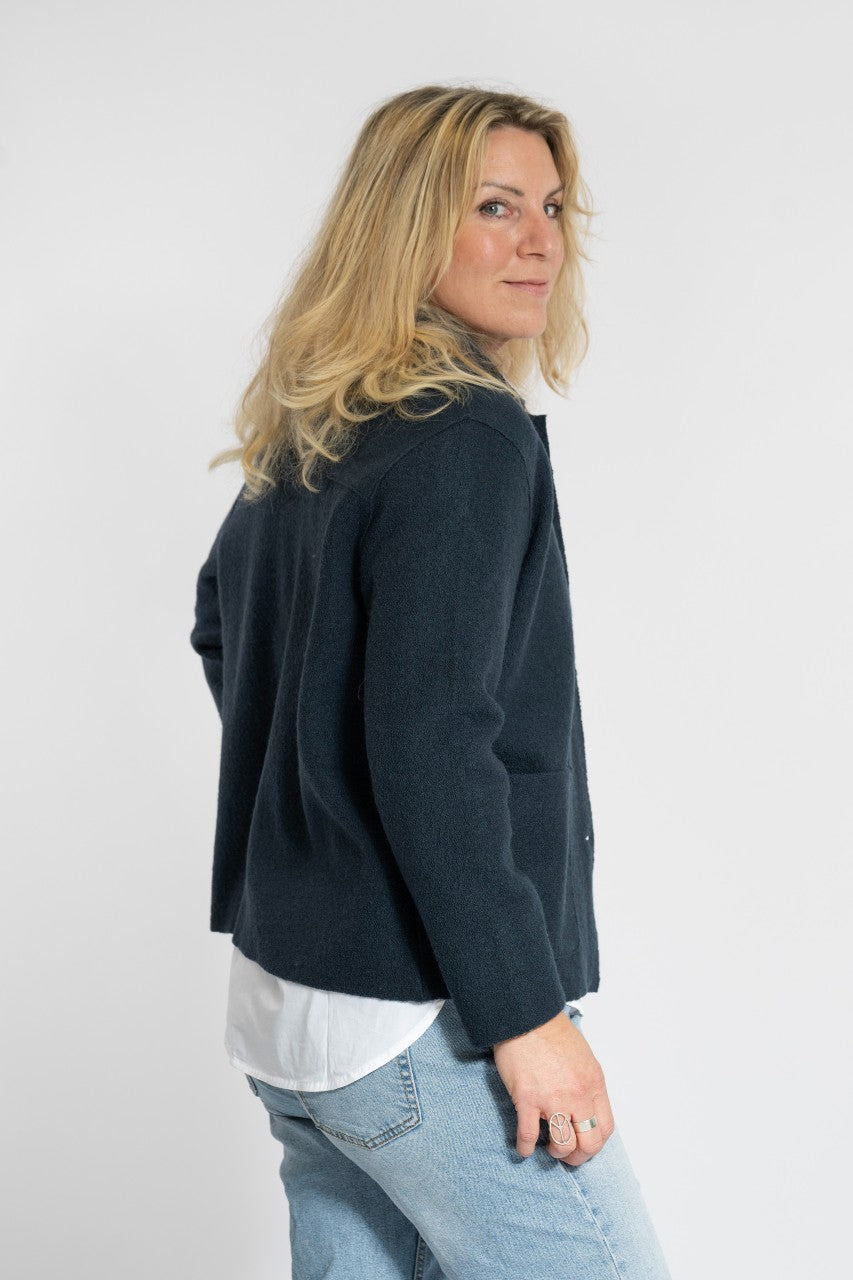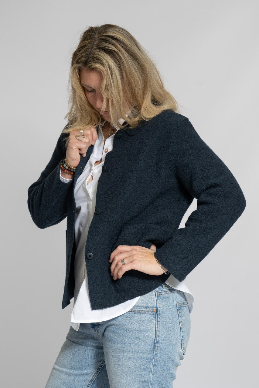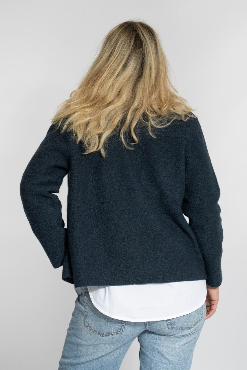 Kavajjacka av ett stickat och lite filtat tyg i helull. Krage och slag. Sköna utanpåfickor. Fungerar både som kavaj och kofta.