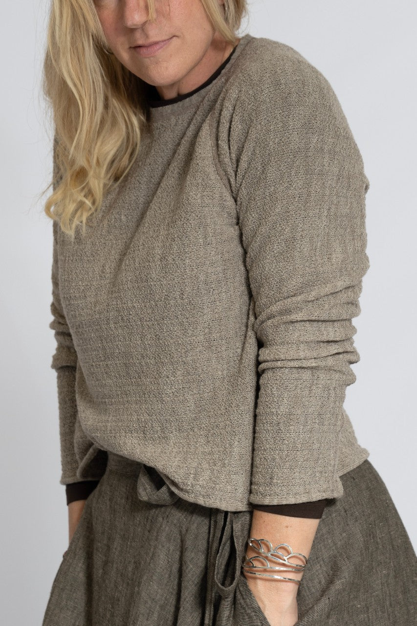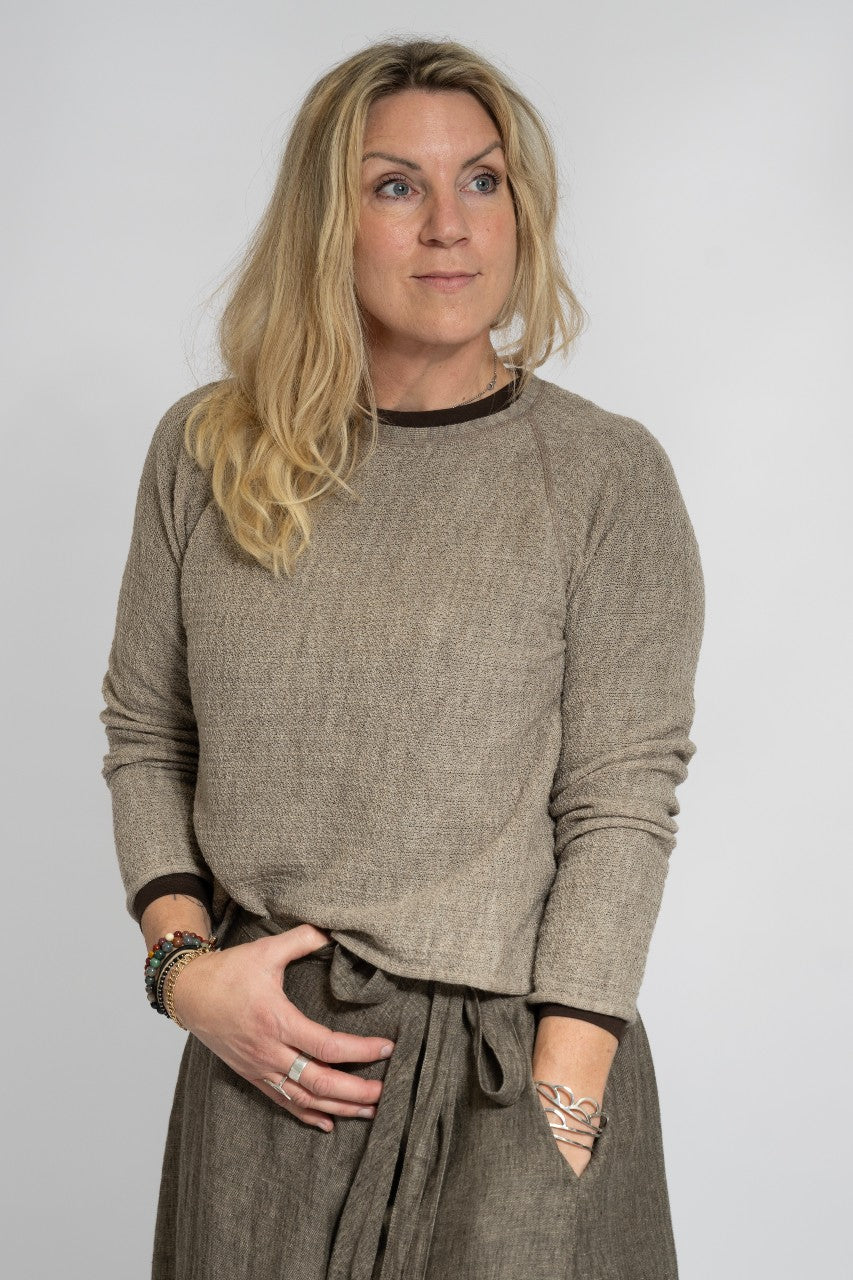 Mosstickad tröja i mjuk ull med raglanärm och fina kantavslutningar. Passar finfint med skjorta under men också som lager ett närmst kroppen.