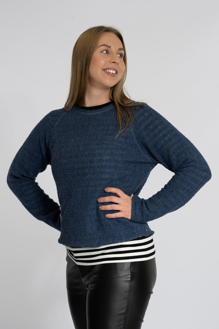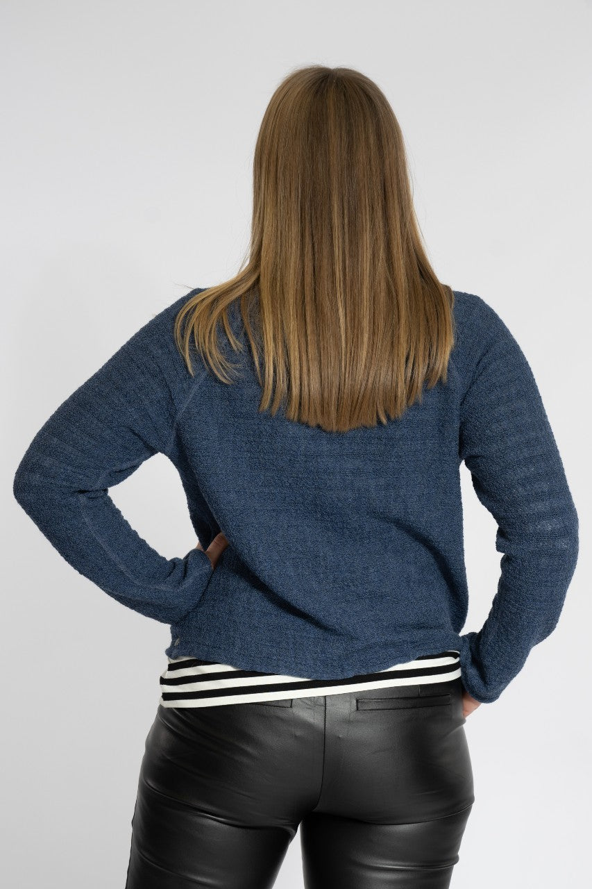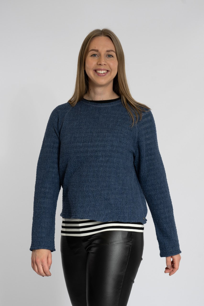 Mosstickad tröja i mjuk ull med raglanärm och fina kantavslutningar. Passar finfint med skjorta under men också som lager ett närmst kroppen.