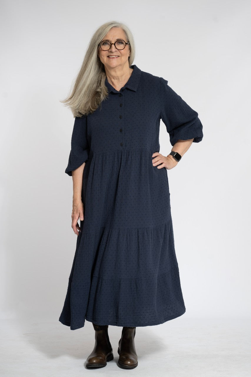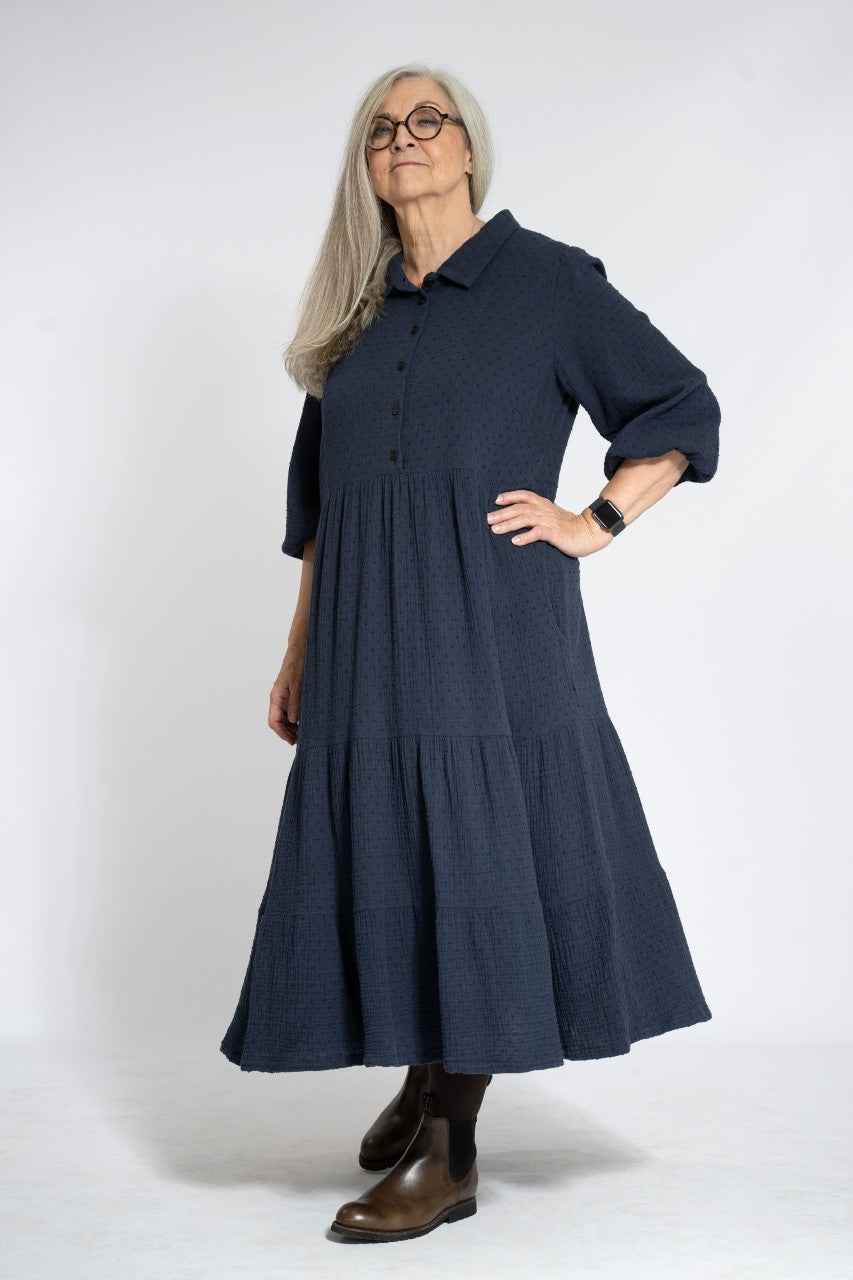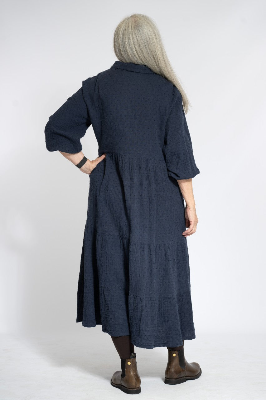 Klänning sydd av en dubbel silduk med små invävda prickar. Fickor i sidorna och krage med knäppning. Klänningen vill gärna åka torktumlare ett tag under torkningen. Då blir den så mysigt mjuk. Resår i ärmen så att den går att skjuta upp